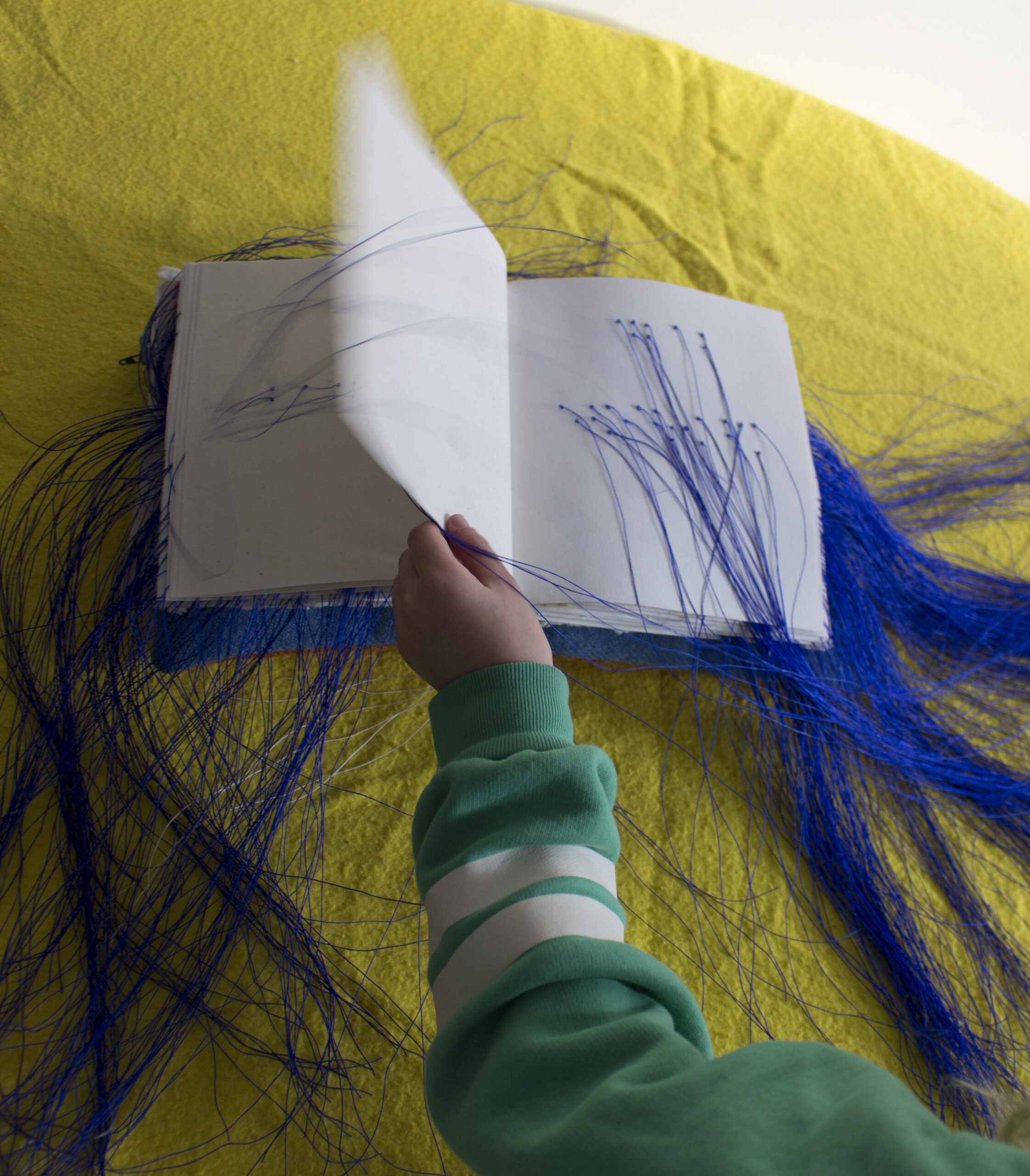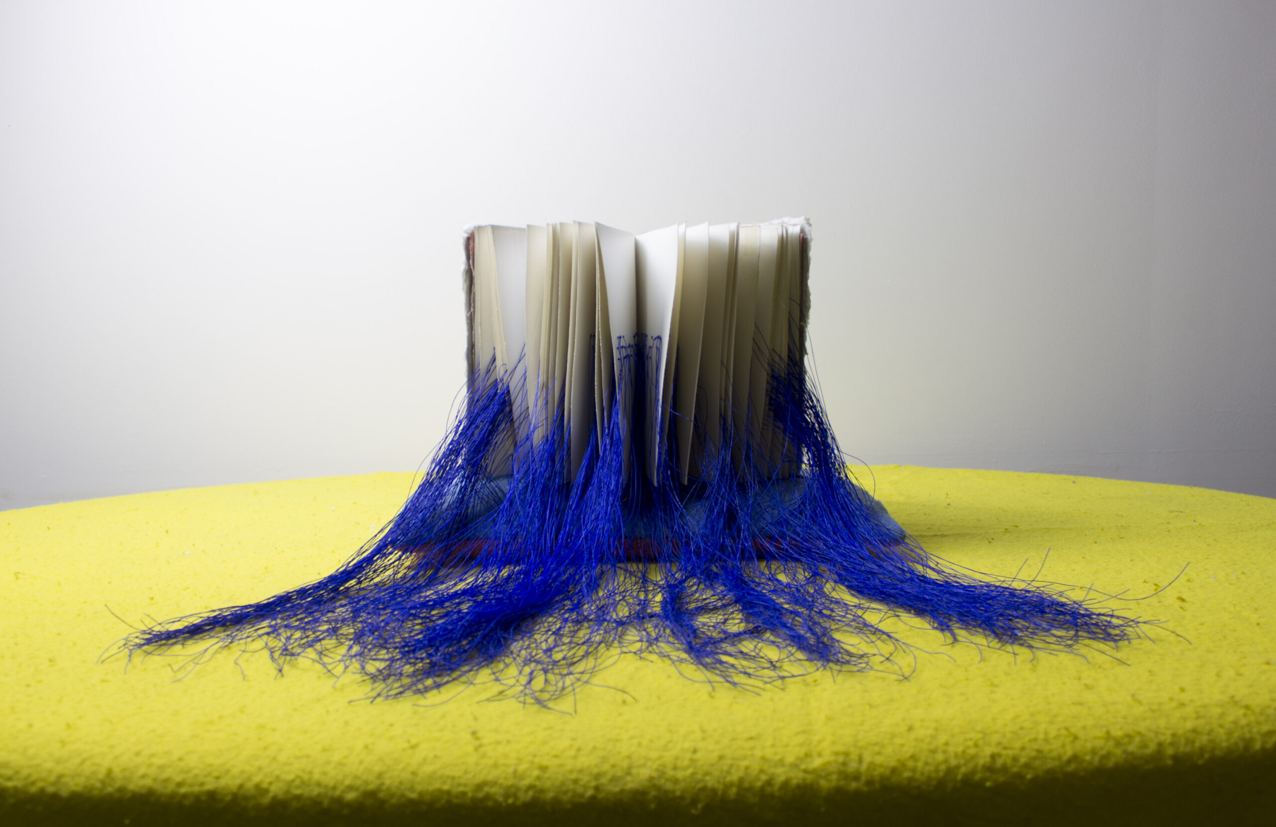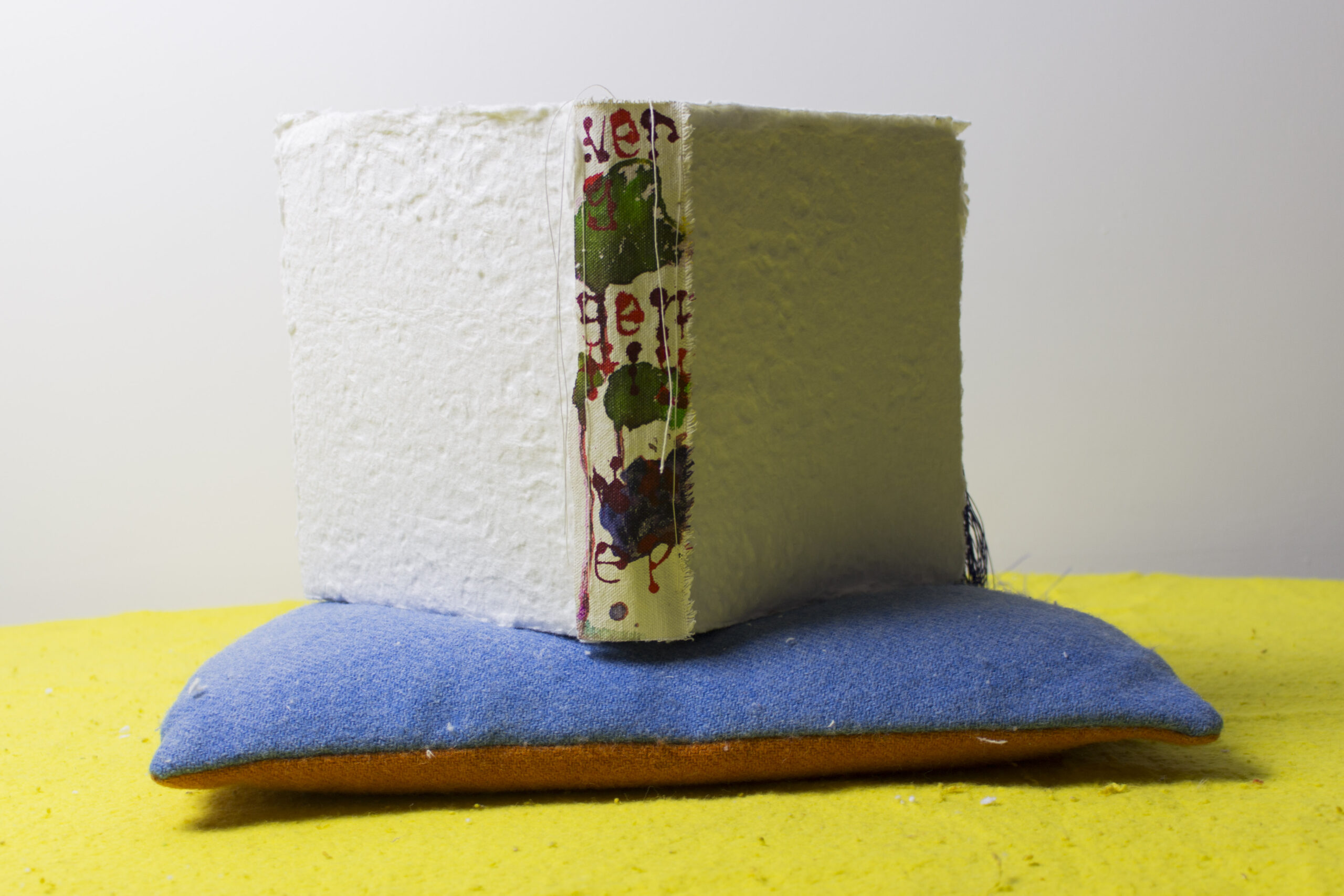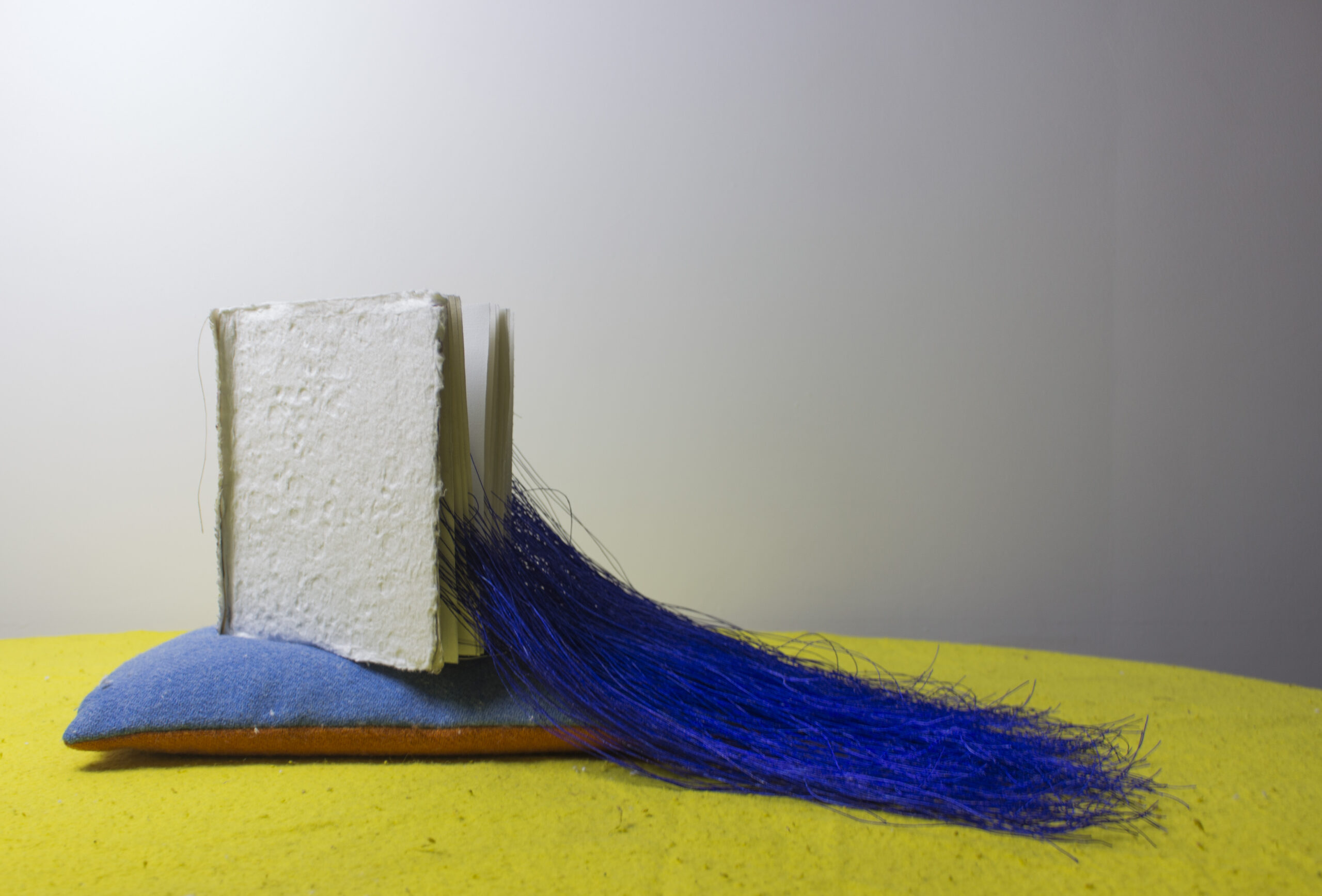 The words for ‘cry’ in fourteen critically endangered languages rendered in Braille on gesso primed canvas scraps, crater paper, marbled paper, fluid acrylic, ink, linen thread, beeswax, book board, pillow, childhood blanket, table, 100 x 80 x 60 cm (approx.), 2024